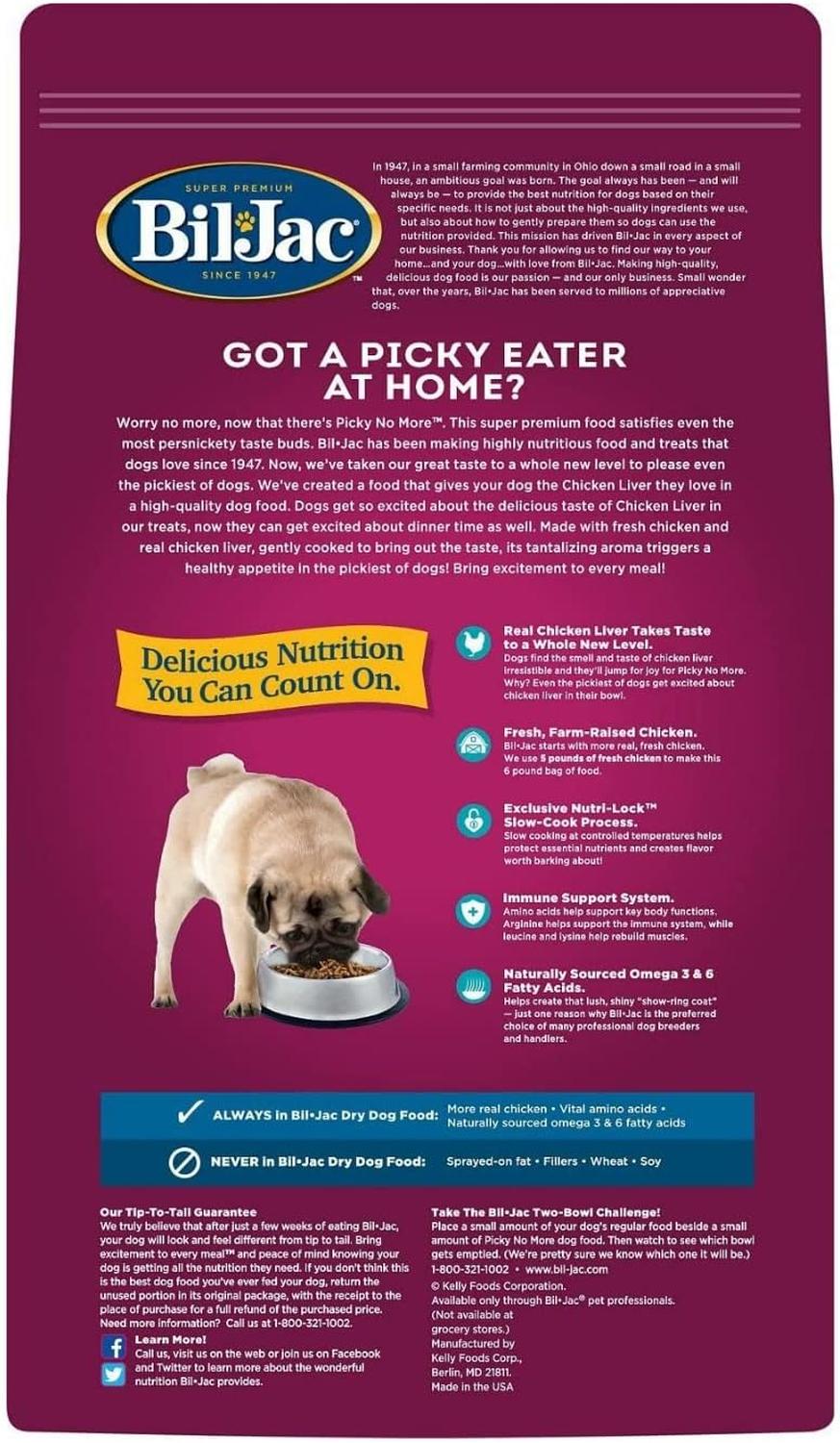 - No se preocupe, ahora cuenta con Picky No More. Este alimento super premium con hígado de pollo hace que su perros disfrute su comida tanto como los premios Bil-Jac.